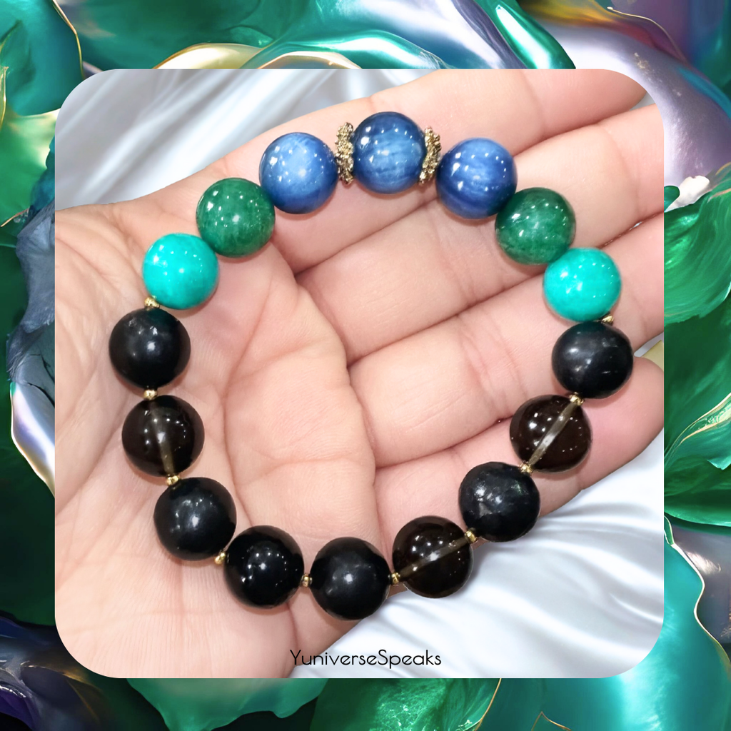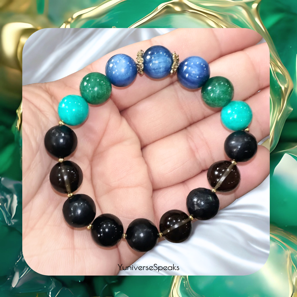 - Stones: Amazonite, Blue Kyanite, Green Aventurine, Shungite, Black Tourmaline, Smoky Quartz