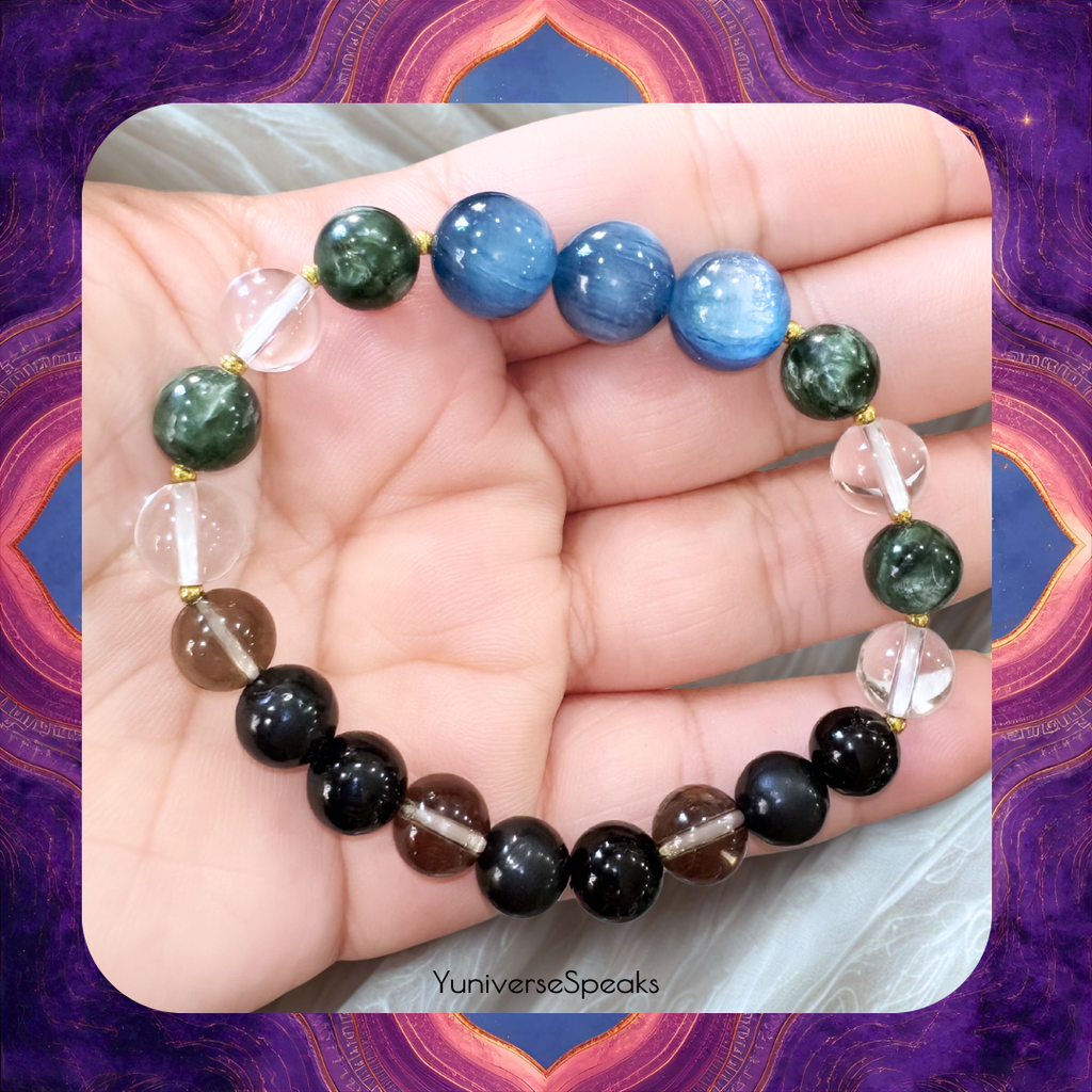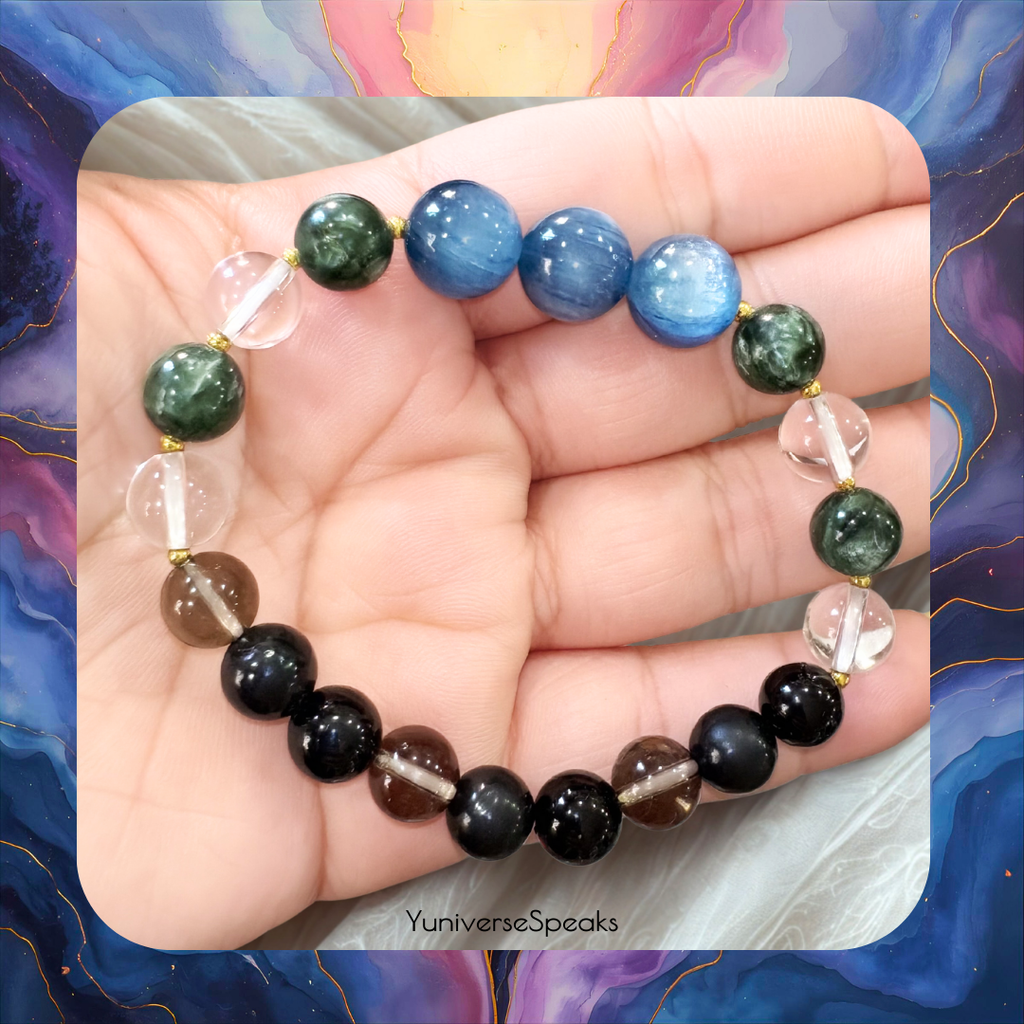 - Stones: Seraphinite, Clear Quartz, Blue Kyanite, Shungite, Black Tourmaline, Smoky Quartz